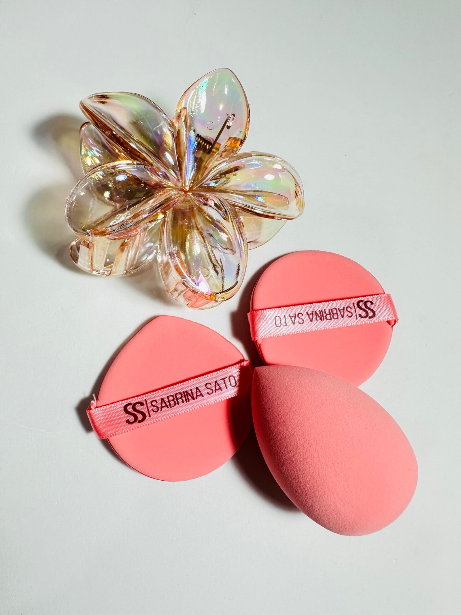 Kit de Beleza Sabrina Sato contendo 1 Piranha de Flor e 3 Esponjas de Maquiagem (1 Gota e 2 Puffs). Cores variadas combinando acessórios e esponjas.